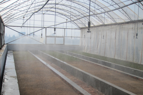 前不久,扦插苗床在抗旱植物研究院正式落成。該苗床位于連棟溫室西南角,占地面積90平方米,內(nèi)置3個(gè)獨(dú)立苗床,為全光照噴霧扦插苗床,每個(gè)苗床約15平方米,按照6*8cm的株行距,最大可同時(shí)扦插育苗12000株。噴頭采用了市場(chǎng)中現(xiàn)行霧化效果較好的十字霧化噴頭,外接智能定時(shí)控制器,保障了苗木能在較適宜的溫濕度環(huán)境中生根發(fā)芽。扦插苗床在抗旱植物研究院的落成,進(jìn)一步提高了公司扦插繁殖效率。
