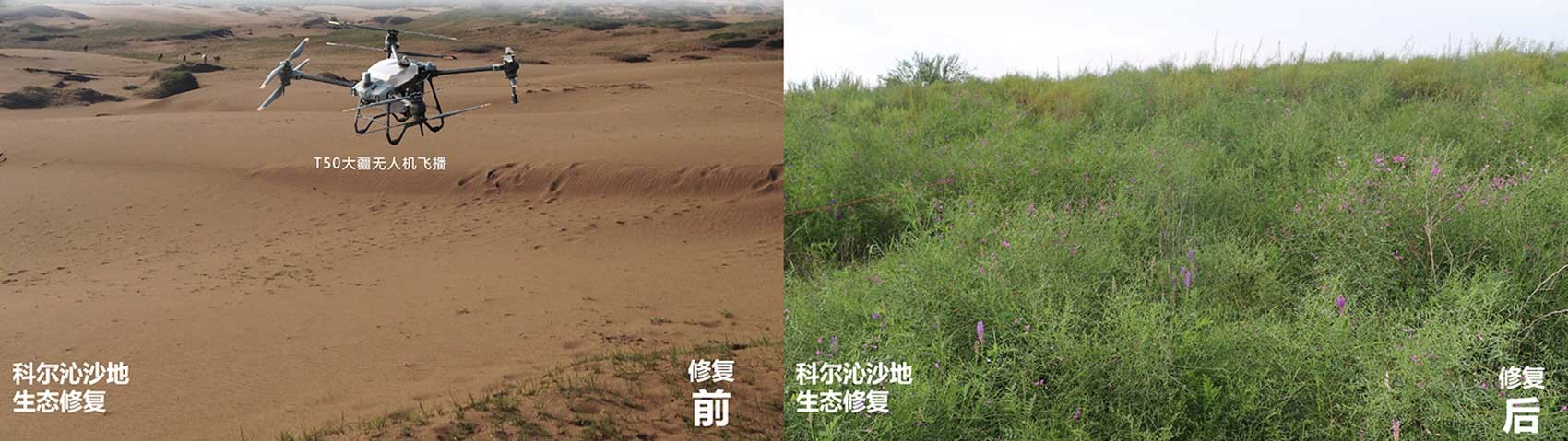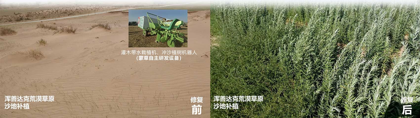 沖沙植樹機(jī)器人(蒙草自研)栽植灌木植物,植被覆蓋度上升30—40個(gè)百分點(diǎn),效果明顯