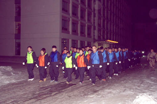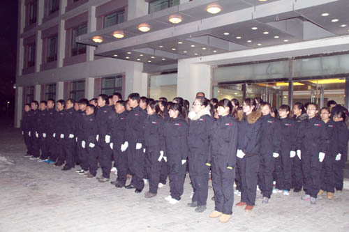 呼呼的刺骨寒風(fēng)、冰凍的堅(jiān)硬路面、急促的集合哨音、響亮的隊(duì)列報(bào)數(shù)、統(tǒng)一的作訓(xùn)服、教官高呼的“三十二字原則”、筆直的隊(duì)列、嘹亮的口號(hào)、數(shù)股白色氣流,此起彼伏的升騰起來(lái)……這就是下午5時(shí)40分黨校學(xué)員1號(hào)樓前的情形,也是這支近兩百人的隊(duì)伍的首次集合。