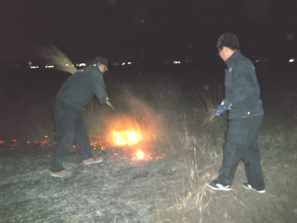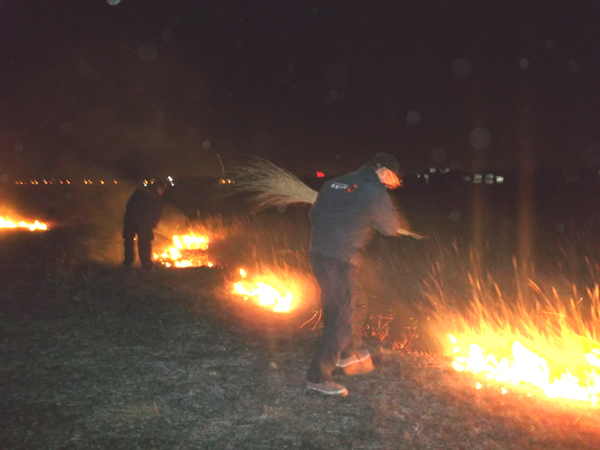 2014年3月26日晚23時,當(dāng)人們還沉浸在溫暖的小家即將進(jìn)入夢鄉(xiāng)的時候,位于呼市新城區(qū)保合少鎮(zhèn)甲蘭板村西側(cè),突然燃起熊熊大火,火勢借助風(fēng)勢迅速蔓延。此時,距離火場2公里外的蒙草抗旱大青山萬畝草原項目部人員還在梳理和安排工作,項目經(jīng)理張成學(xué)接到火情電話后,迅速布置安排。大家拿起項目部儲備的滅火工具,組成臨時救火隊奔向大火現(xiàn)場。