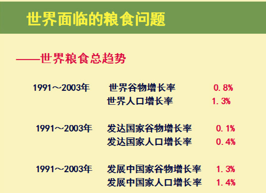 1991-2003年,人口一直在增長,谷物并未增長。糧食能夠自足的國家只有45個,188個國家缺少糧食,需要從國外進口。全球有6個出口國,卻有近200個進口國。全世界耕地面積由1961年的12.8億公頃到2002年的14億公頃,但由于人口的增長,世界的人均耕地面積由0.42公頃下降到0.2公頃。