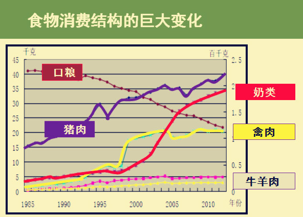 2002年,我國飼料糧是2.3億噸,占糧食總產量的38%。生豬占60%,家畜、家禽占21%,水產養(yǎng)殖占8.5%??梢钥闯觯诩Z主要是由豬和雞造成的,因此提出食物改變的問題。