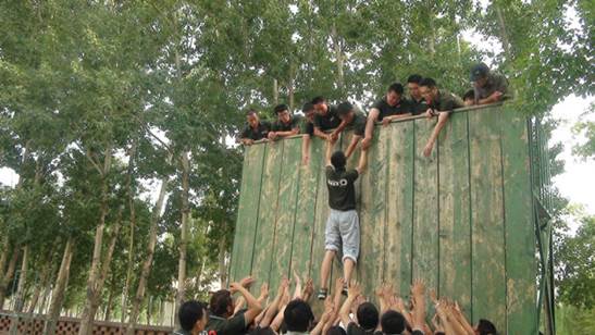 ★最后一個項目是畢業(yè)墻,團隊成員分工明確,攀爬隊員按照規(guī)定動作攀爬,支撐隊員挺起堅強的肩膀,先行爬上去的隊員用“生死扣”緊緊抓住攀爬隊員,其他人高高舉起雙手,保護著每一位攀爬的小伙伴,也感動著每一位在場的人。
