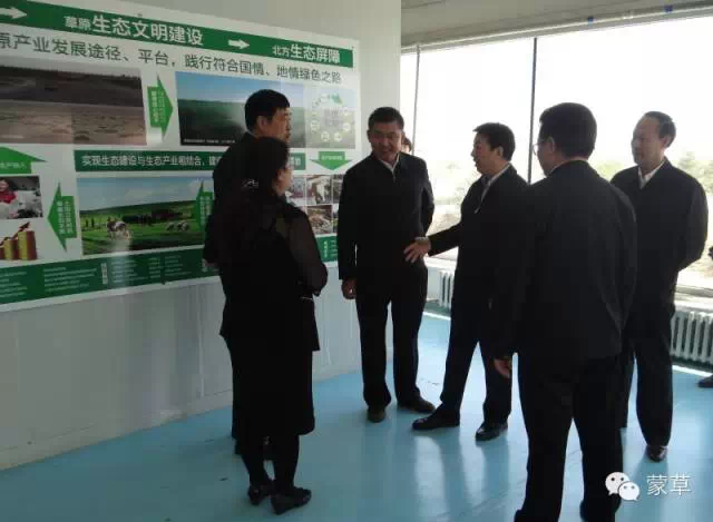 馮新柱一行在蒙草展廳觀看蒙草發(fā)展歷程圖片展