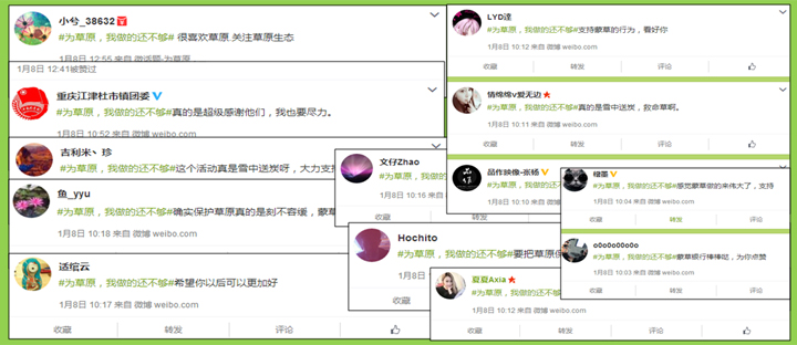 近日剛剛結(jié)束的“為草原發(fā)聲”活動(dòng),以#為草原,我做的還不夠#為話題,更是吸引人們?cè)谖⑿排笥讶臀⒉┲邪l(fā)布視頻、文字,訴說(shuō)草原情懷。草原上“馬、牛、羊、花、草”的精神,激發(fā)出人們心中對(duì)于草原的深情厚愛(ài)以及堅(jiān)韌質(zhì)樸的草原性格,也深深地感動(dòng)了許多人,微博話題得到1800多萬(wàn)次的閱讀,微博1小時(shí)熱門(mén)話題榜排在第四位。網(wǎng)友紛紛留言,“第一次如此真切地感受到草原的精神”、“我們應(yīng)該將草原精神傳承下去”“蒙草是救命稻草、是雪中送炭,希望蒙草能做大做強(qiáng),這樣就能保護(hù)更多的草原。”