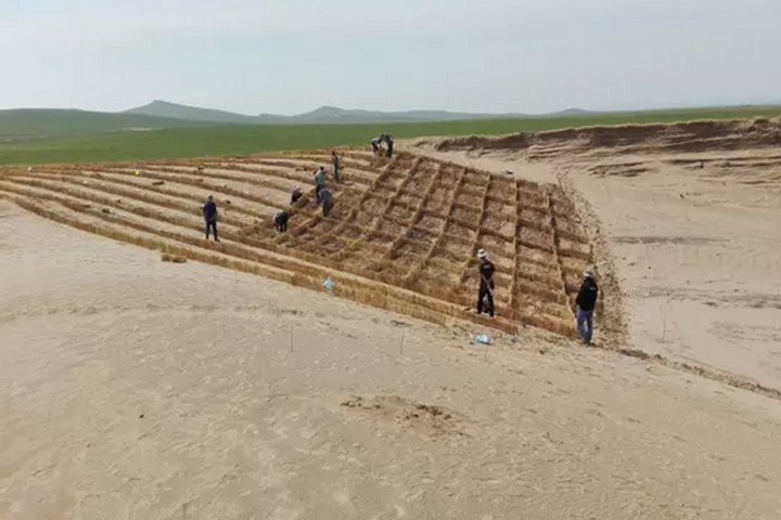 據(jù)研究人員介紹:烏拉蓋草原存在一條暗沙帶,近年來由于過度放牧,出現(xiàn)了多個大的風(fēng)蝕坑。在風(fēng)蝕坑中分為陡坡區(qū)、緩坡區(qū)、平坦區(qū),復(fù)雜的風(fēng)蝕地貌需要不同的修復(fù)方法。在沙地中心風(fēng)蝕坑采用埋置機械沙障+生物沙障+人工撒播+枯草鋪設(shè),在緩坡區(qū)采用人工撒播+葦簾鋪設(shè),在陡坡區(qū)采用人工撒播+葦簾鋪設(shè)+鐵絲網(wǎng)鋪設(shè),在平坦區(qū)采用圍欄封育。制定不同組合修復(fù)方式,避免外界因素的干擾,還原植物生長的環(huán)境。使天然植物物種得意休養(yǎng)生息,煥發(fā)植物自我修復(fù)的能力抑制草原繼續(xù)沙化。與此同時,研發(fā)人員還采用一年生與多年生植物種子、豆科和禾本科植物種子進行混播,讓一年生的植物快速生長,為多年生的植物提供適宜的生長環(huán)境,從而達到防沙、固沙的目的。