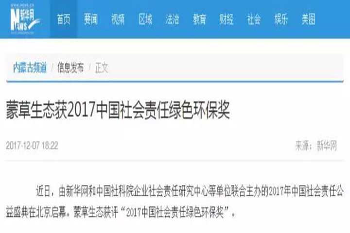 ▲蒙草獲“2017中國(guó)社會(huì)責(zé)任綠色環(huán)保獎(jiǎng)”