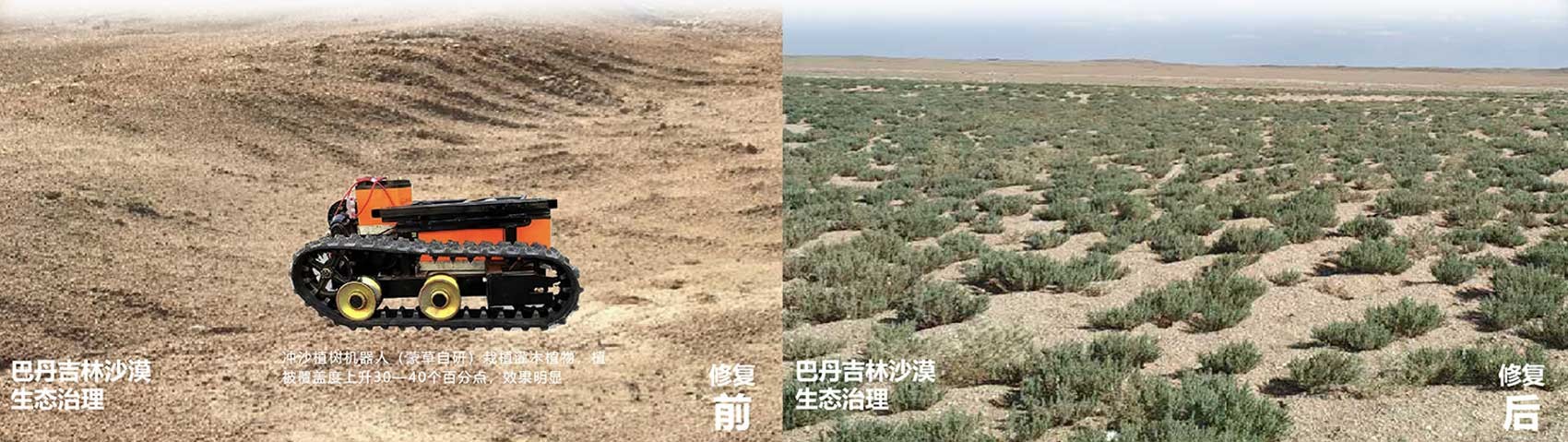 沖沙植樹機(jī)器人(蒙草自研)栽植灌木植物,植被覆蓋度上升30—40個(gè)百分點(diǎn),效果明顯
