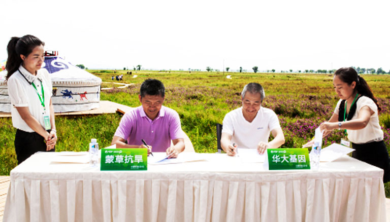 雙方在蒙草抗旱承建的呼和浩特市大青山萬(wàn)畝草原現(xiàn)場(chǎng)簽署合作協(xié)議 在8月5日舉行的小草行動(dòng)•2013系列活動(dòng)中,蒙草抗旱與深圳華大基因