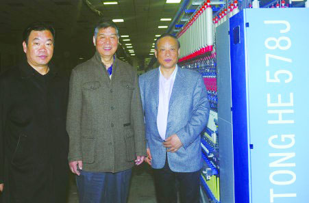 河南省舞鋼市銀龍紡織集團(tuán)董事長(zhǎng)魯耀宏(左)、河南省紡織行業(yè)協(xié)會(huì)會(huì)長(zhǎng)李書(shū)勤(中)、常州市同和紡織機(jī)械制造有限公司董事長(zhǎng)崔桂生(右)在銀龍紡織車(chē)間同和公司生產(chǎn)的TH578J型集聚紡自動(dòng)落紗細(xì)紗機(jī)長(zhǎng)車(chē)前合影。